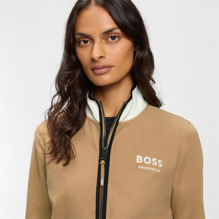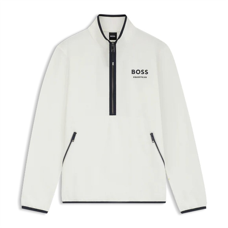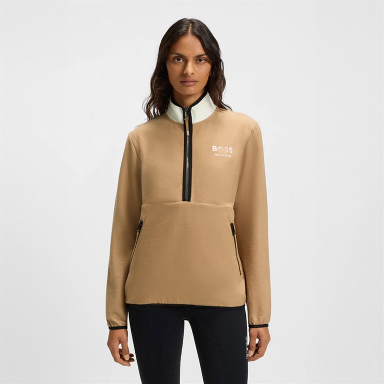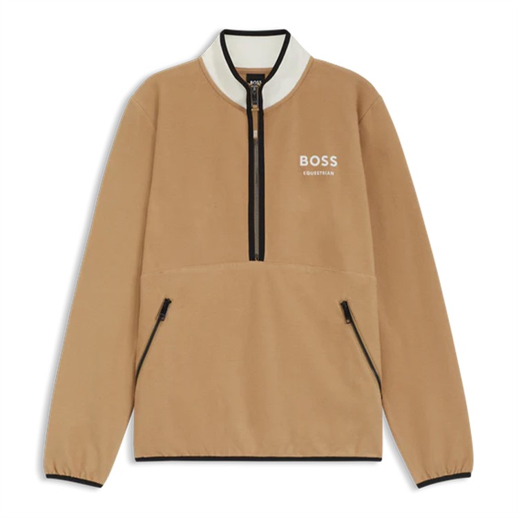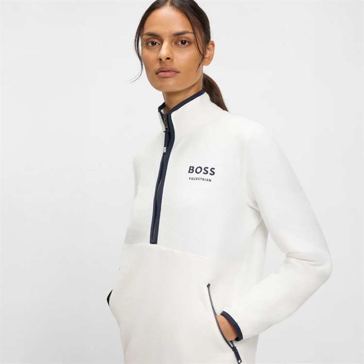 Delikat genser med halv glidelås og kontrastglidelåser, brodert Boss Equestrian-logo på brystet og glidelåslommer foran.