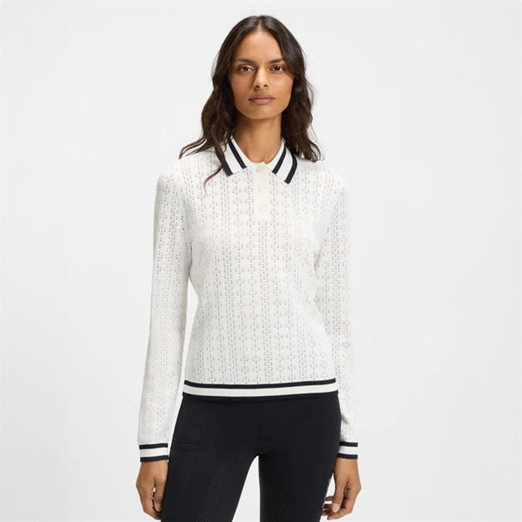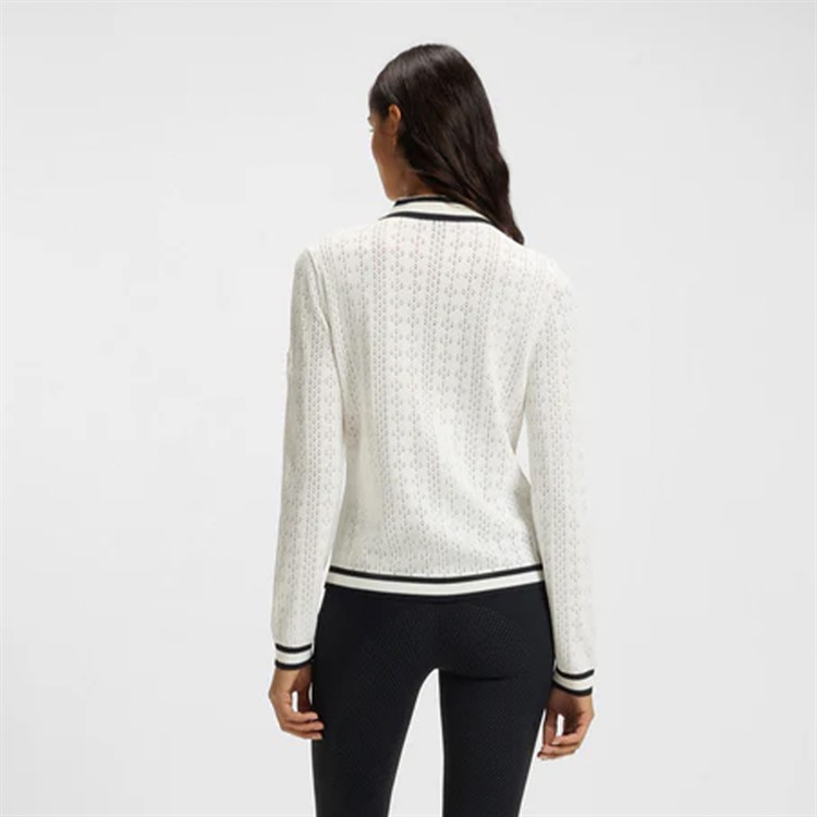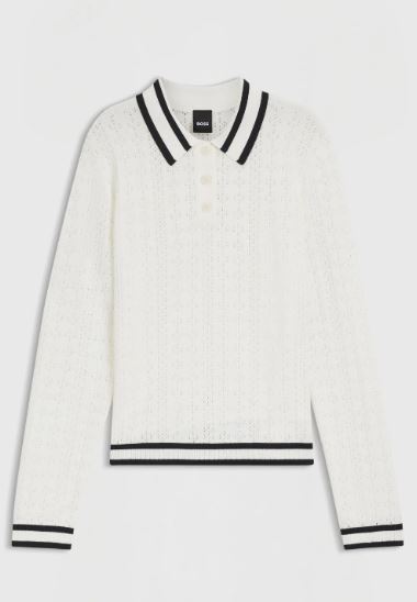 Finstrikket polo genser med to kontraststriper på kragen, ermene og kanten. Knappestolpe med 3 knapper og BOSS-lapp i kunstskinn på venstre erme.