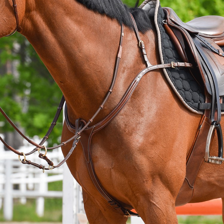 Stilig bryst i eksklusivt italiensk skinn med hvite sømmer og messingspenner.
