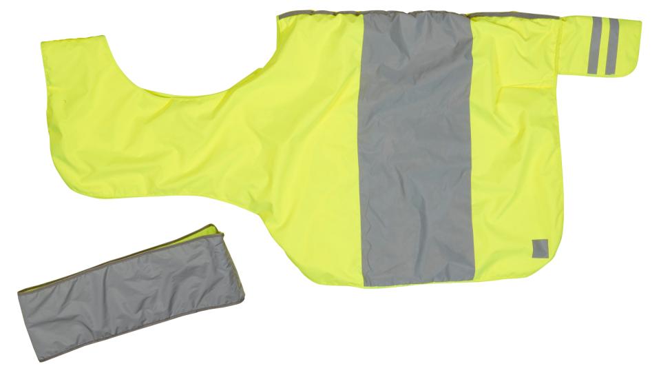 Refleksridedekken med haleklaff og refleksbånd rundt halsen. Horse Guard b’seen logo. Lys neongul farge for ekstra synlighet.