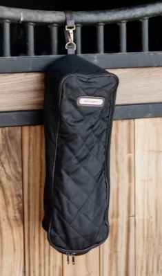 Kentucky Horsewear Bridle Bag tilbyr beskyttelse til hodelaget ditt under transport, på stevner eller hjemme. Bridle Bag har kunstig kaninpels på innsiden for å unngå riper på skinnet. Den har en krok på innsiden for enkel festing av bittet ditt. Navneskiltet på forsiden kan snus for å personaliseres. Bridle Bag kan festes til hva som helst takket være kroken og ringen på toppen. Den har den samme diamantquiltingen som vår stallsett (gardin, vakt, hodebeskytter) og tepper! Derfor kompletterer denne Bridle Bag Kentucky-showlooken. Den kan vaskes i maskin på 30 °C, uten tørketrommel.