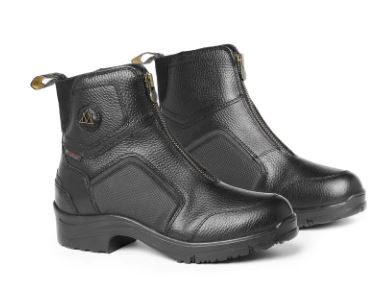 En varm ridesko med glidelås, vanntett fotdel og nedfellbar brodd i helen.