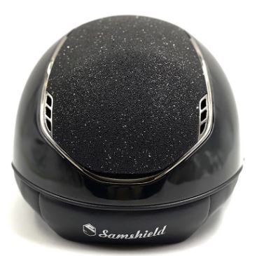 Miss Shield Glossy i svart med krystallstoff på toppen og frontbåndet i svart. Blasonering og lister i svart krom.